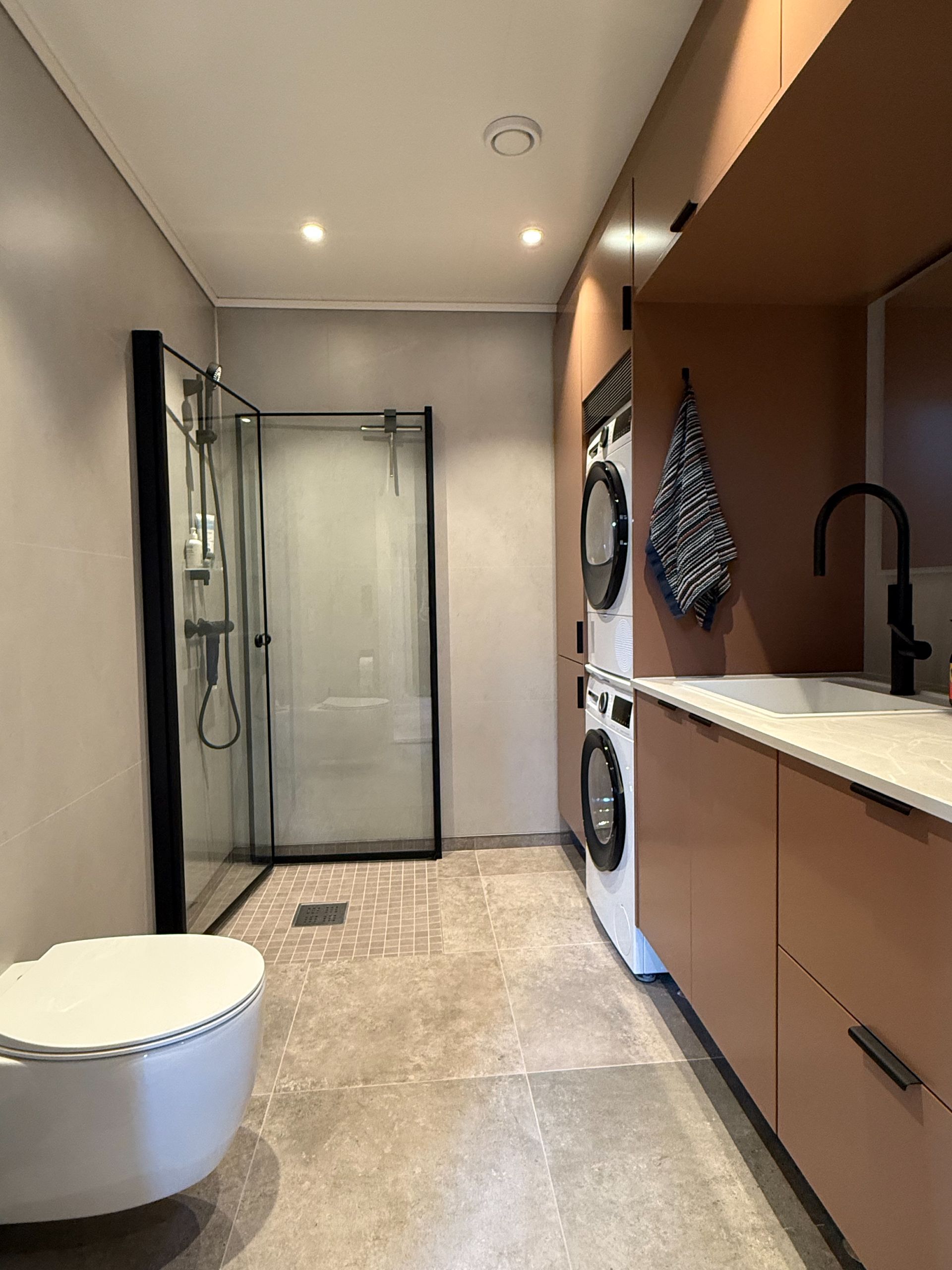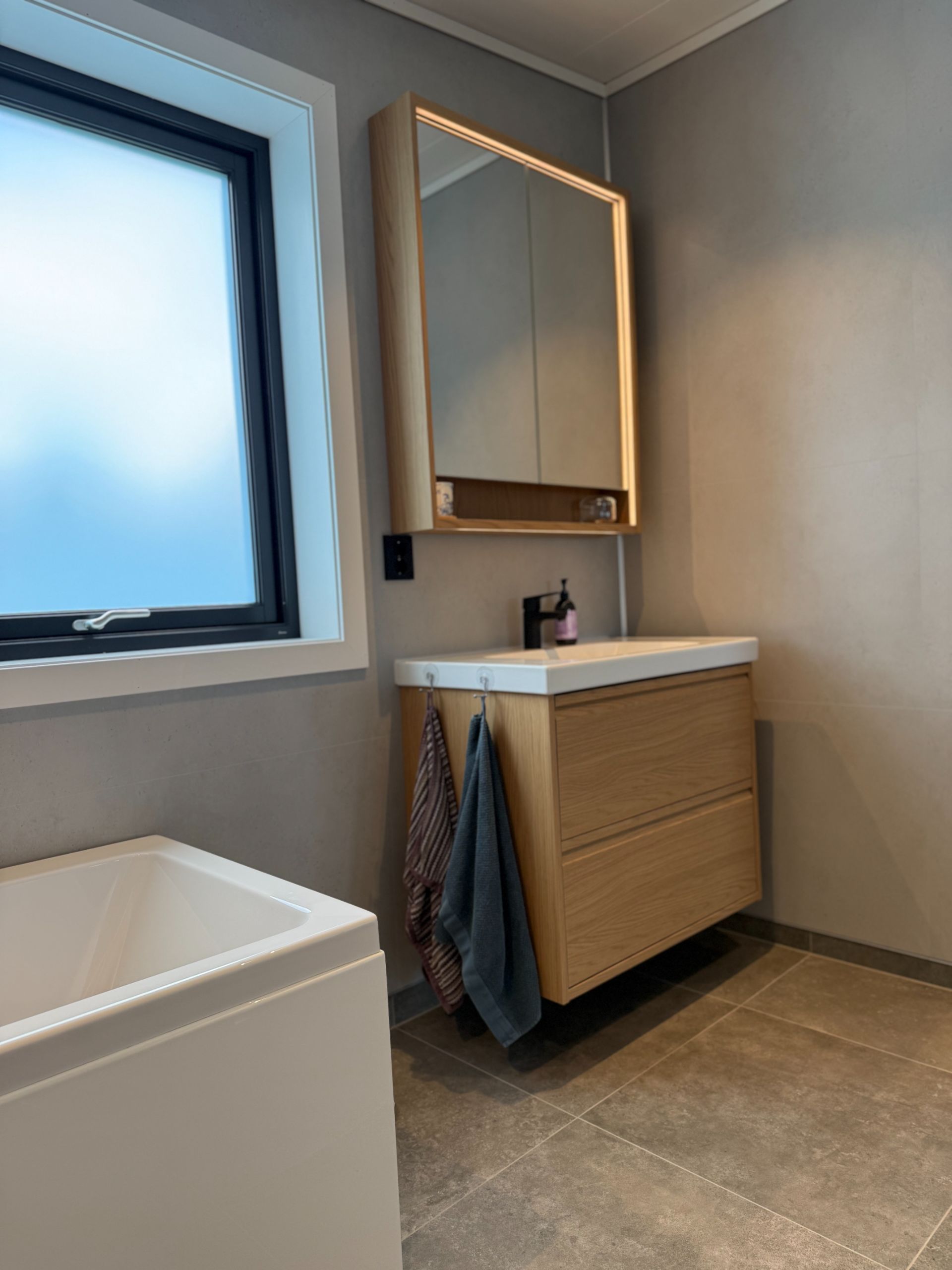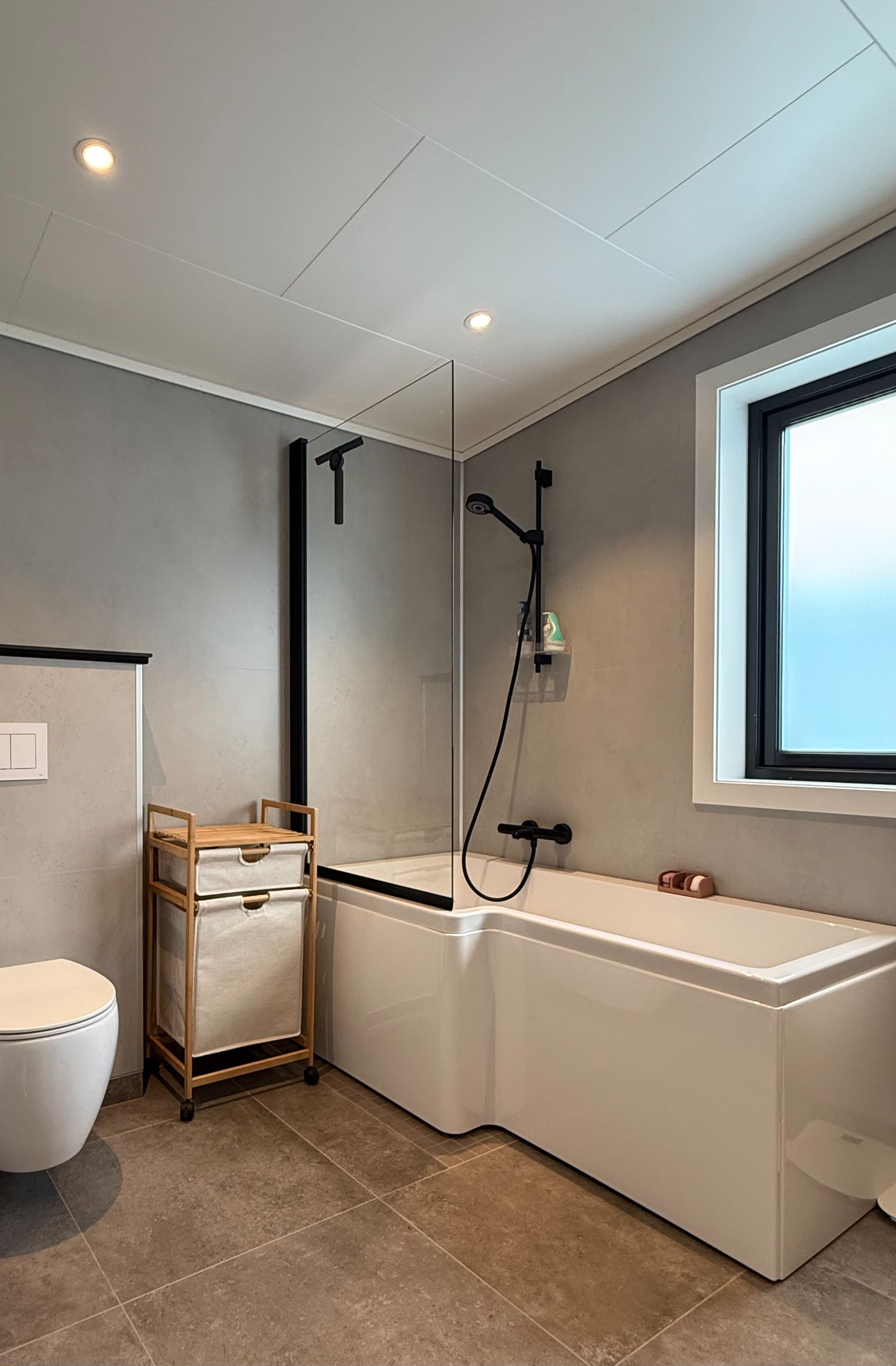 Anlegget vert levert komplett, med 200l VVT, avløp og uttak for vaskemaskin og oppvaskmaskin. Det leveres dusjutstyr, dusjvegger og servant kraner i krom utførelse.