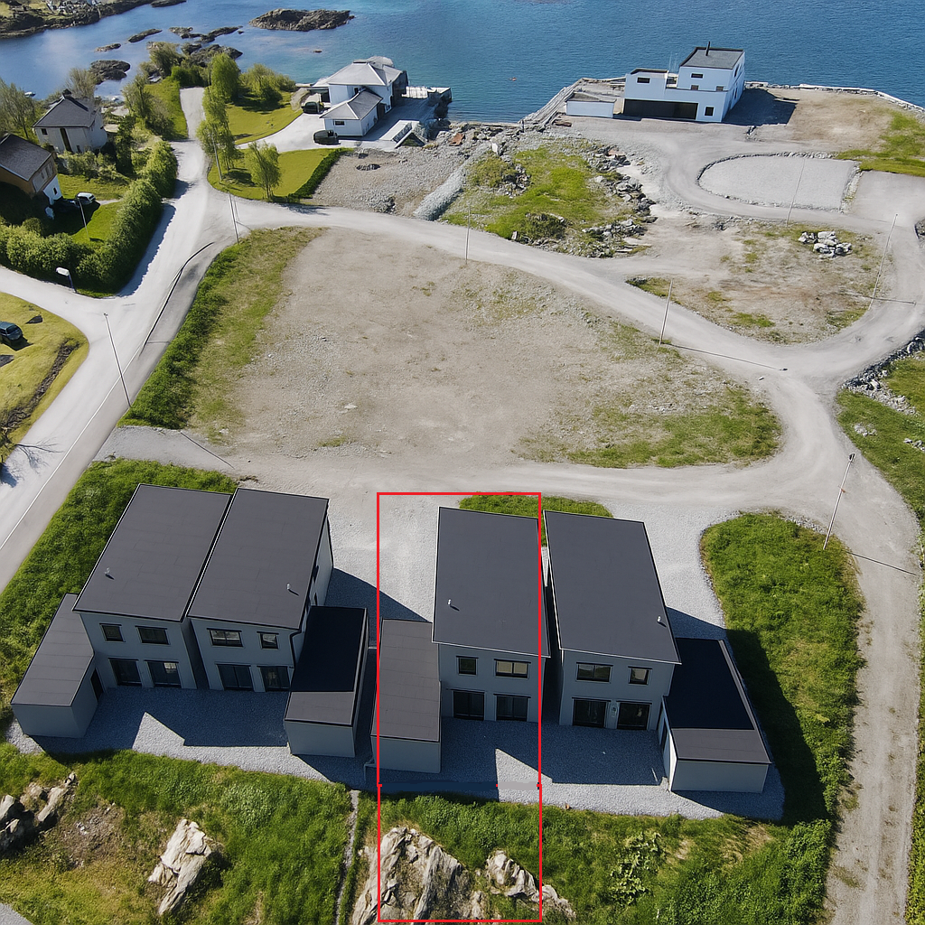 Boligen leveres med asfaltert innkjørsel, som ferdigstilles helt inn i carport. Øvrige områder stelles til med stedlige masser for videre arbeid som egen innsats.